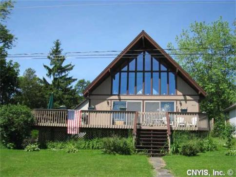 Beautiful A Frame home with lake front access and dock. Two bedrooms and full bath on main floor. Second level has bedroom/loft with roughed in plumbing for second full bath. Kitchen has granite counter tops, cherry cabinetry, and breakfast bar. Open floor plan has dining room/living room combination, cathedral ceiling and two story windowed wall providing a spectacular view of the Lake. Sliding glass doors open onto wrap around deck. Detached two car garage connected to house via the deck has second floor storage area. Full basement has additional outside entrance and coal burning stove.