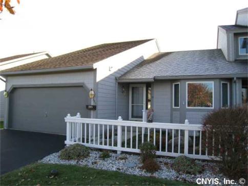 Single level, 3 BR, 3 BA end unit townhouse on cul de sac in Erie Village overlooks golf course. Kitchen has pantry and breakfast area with bay window. Living room has cathedral ceiling with fan and skylights with shades. Sliding glass doors on either side of gas fireplace open onto private deck overlooking 7th fairway and pond. Master bedroom has cathedral ceiling with fan and adjoining master bath. Beautifully finished basement has family room, third bedroom, and full bath. Close to shopping and Northeast Medical Center. Just twenty minutes to downtown Syracuse. Enjoy the beach at Erie Lake.