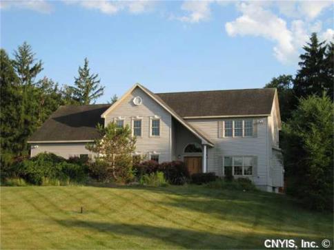 Beautiful 4 bedroom, 3.5 bath colonial with 3 car garage on 3.7 acre partially wooded lot. Gleaming hardwood floors. Large living room has gas fireplace and tall windows for lots of natural light. Formal dining room with recessed lighting. Kitchen has ceramic tile floor, 5 burner gas cooktop, double built in electric ovens, wine cooler, solid surface countertops and breakfast bar. Enclosed porch transitions to large deck. Large master bedroom with walk in closet, master bath with whirpool tub. Finished basement with full bath has wet bar area and walkout to side yard. First floor laundry.