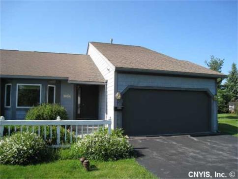 Bright, airy, single level, 2 bedroom, 2 bath end unit townhouse with open floor plan and 2 car garage in desirable Erie Village. Large kitchen has breakfast area with bay window. Living room has vaulted ceiling with skylights and ceiling fan. Sliding glass doors on either side of gas fireplace open onto private deck. Hardwood floors. Master bedroom has cathedral ceiling with fan, large walk in closet, and sliding glass door to deck. All appliances stay. Twenty minutes to downtown Syracuse. Close to shopping and Northeast Medical Center. Walk the nature trail and enjoy the beach at Erie Lake.